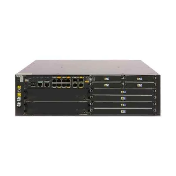 This model includes two redundant AC power modules for high availability and uninterrupted operation in critical network environments.